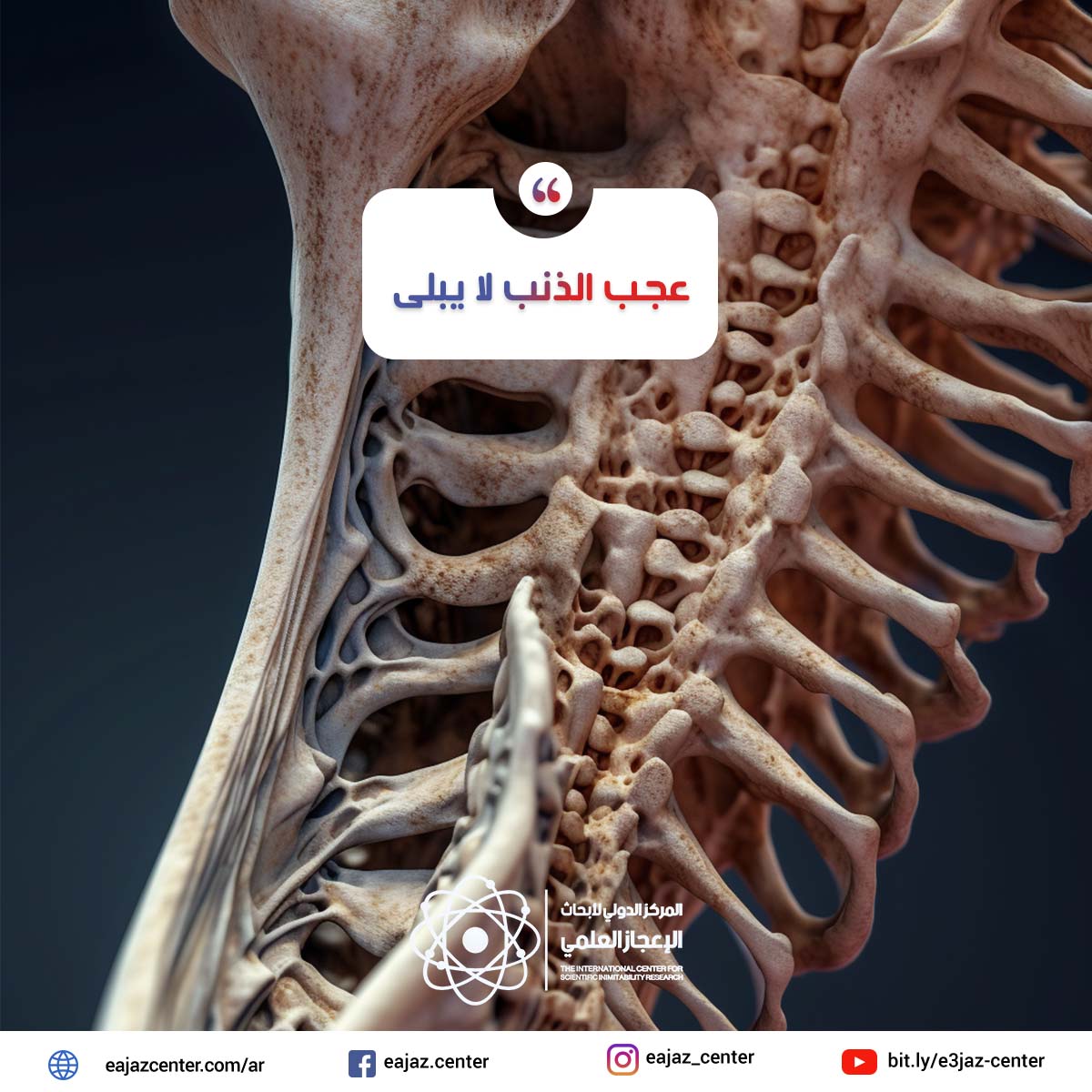 عجب الذنب : يكون فى عظم رَأسُ العُصْعص ، ويقالُ له: (عَجْم) بالمِيم، وهو أوَّلُ ما يُخلَقُ مِن الآدميِّ ، وهو الَّذي يَبقى مِنه ليُعادَ تَركيبُ الخَلقِ عليه يومَ القيامةِ. أما علماء الأجنة والبيولوجيا الحيوية فيرون أنه بقايا خلايا الخيط الأولى وهى خلايا كاملة القدرة والتى بدأ الجنين فى النشأة والتكوين منها.