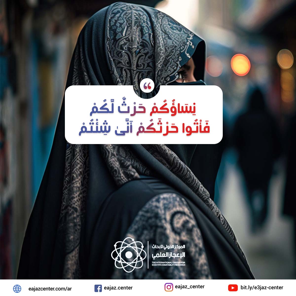 وجه من أوجه الإعجاز البلاغى فى الآية أن فيها تشبيه بليغ لمحسوس بمحسوس، وهو أكثر أنواع التشبيه بلاغة، فشبه الله النساء بالأرض المحروثة ، وحُذفت أداة التشبيه (الكاف)، وحُذف وجه الشبه، لإستثارة العقل للبحث عن كيفية حراثة النساء لمني الرجال كما نشاهد حراثة الفلاح لأرضه. ووجه آخر للإعجاز العلمى فى الآية من قوله تعالى (حرث لكم) يتمثل فى تمزق خلايا الطبقة العلوية لبطانة الرحم وطرحها ، ونزف الدم ، واستثارة الرحم بعد اخصاب البويضة ، واستبداله بطبقة جديدة ، وزيادة سمكه ، بزيادة تدفق الدم المحمل بهرمونى الإستروجين والبروجستيرون والمواد الغذائية إليه لغرس الجنين المتولد من البويضة المخصبة ، ولتثبيت الحمل ، كما يحدث لحرث الأرض مع تقليبها وريها بالماء لاستقبال البذرة ونموها لتخرج نباتها ، فجمعت كلمة (حرث) كل هذه المعانى العلمية الدقيقة التى تحدث فى الرحم ، وكان هذا سبقا علميا للقرآن الكريم إذ لم يتفطن العلماء لهذه المعلومات إلا فى آواخر القرن العشرين وهذا يدل على صدق الرسالة وصدق الرسول ﷺ.